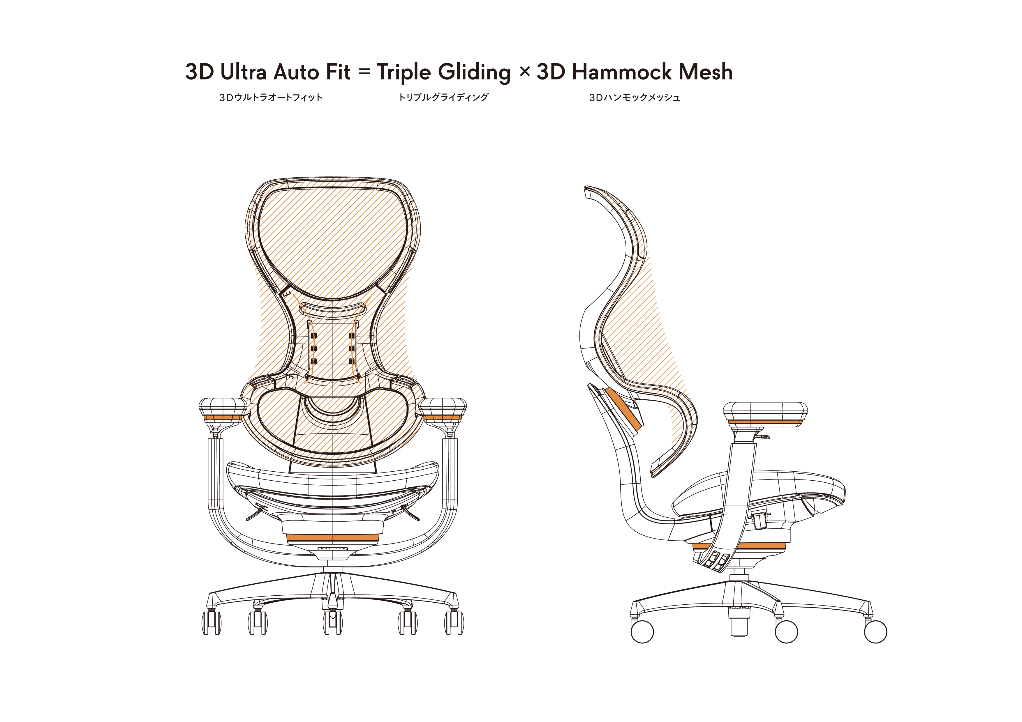 座面下、背もたれ、肘掛け部の3か所に搭載し、身体の動きに合わせて柔軟に可動するトリプルグライディングと、従来のオフィスチェアーによく見られる背もたれ左右のフレーム構造を使用せず、立体的な面形状をかなえた3Dハンモックメッシュ。これらを組み合わせたコクヨ独自の「3Dウルトラオートフィット機構(*1)」により、「座る」ではなく「まとう」ような、身体と一体になるこれまでにない新感覚の座り心地を実現。エンジニアやプログラマーなど長時間スクリーンに向かうワーカーの快適性と集中力のさらなる向上を目指す、次世代のオフィスチェアーです。